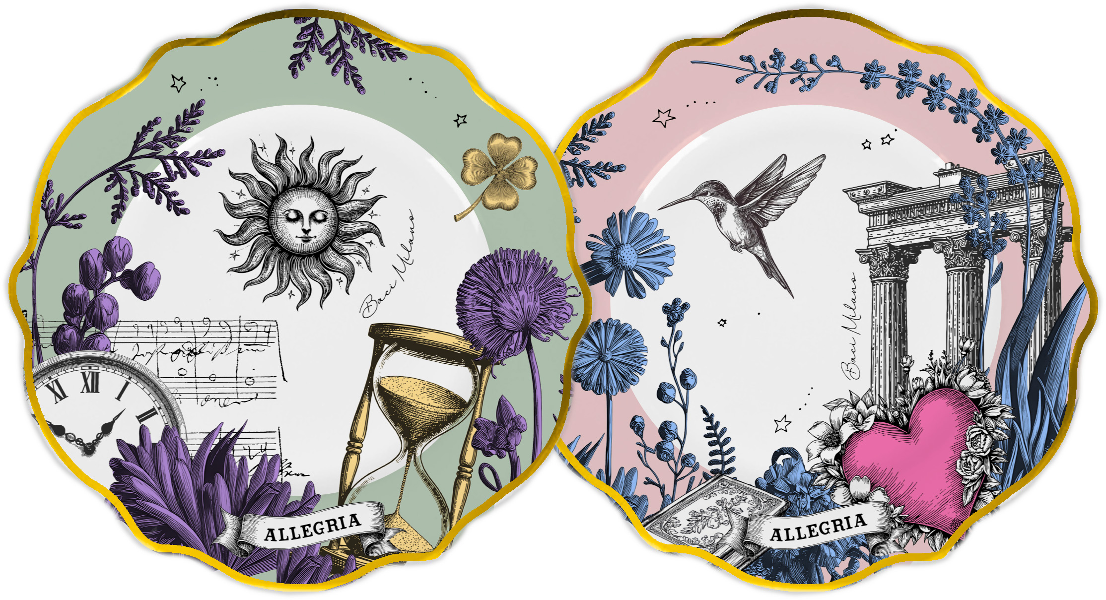 Εμπνευσμένη από έναν σουρεαλιστικό και μαγεμένο κήπο, η Allegria τυλίγει το βλέμμα με τα παστέλ χρώματά της και σας μεταφέρει σε έναν κόσμο όπου τα λουλούδια συνυφαίνονται με ονειρικά σύμβολα όπου συνδέονται με τον χρόνο και τη φαντασία, δημιουργώντας μια αιωρούμενη και ποιητική ατμόσφαιρα.