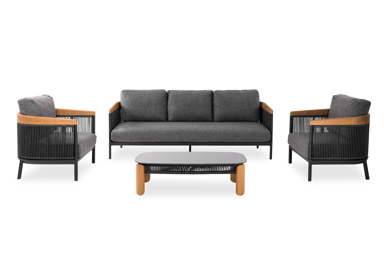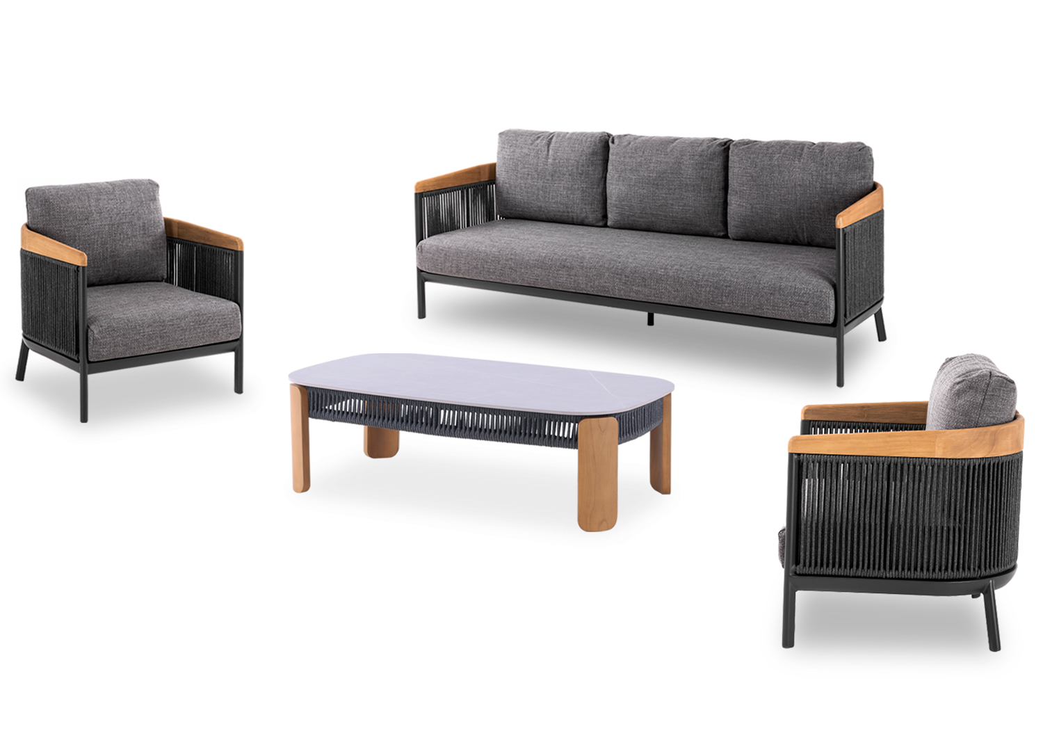 Καθιστικό Κήπου αποτελείται από έναν καναπέ τριών θέσεων, δύο πολυθρόνες και ένα βοηθητικό κήπου. Συμπεριλαμβάνονται τα μαξιλάρια.