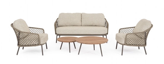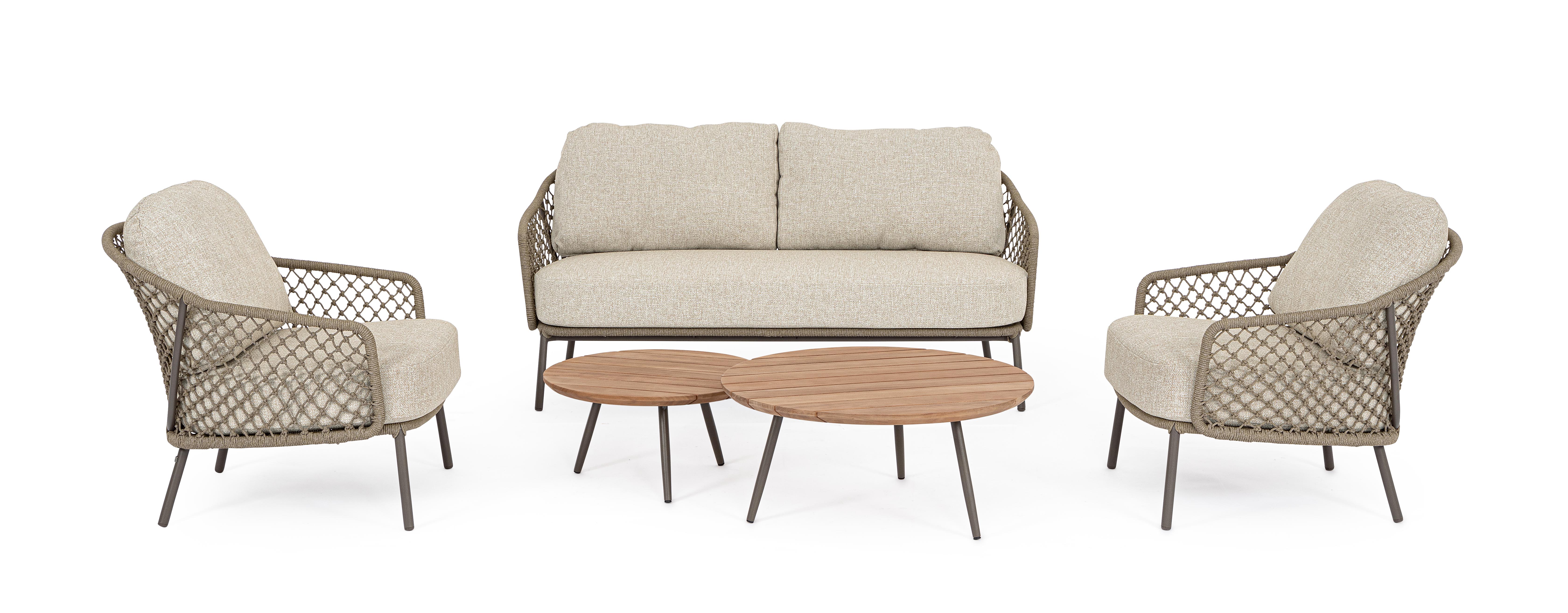 Καθιστικό κήπου που αποτελείται από έναν καναπέ 2 θέσεων, 2 πολυθρόνες και δύο βοηθητικά τραπεζάκα. Ο σκελετός είναι αλουμινίου και η πλέξη από olefin.Συμπεριλαμβάνονται τα μαξιλάρια πλάτης και καθίσματος με αφαιρούμενο κάλυμμα από αντηλιακό ύφασμα olefin. Διαθέσιμο κατόπιν παραγγελίας εντός 20 εργάσιμων ημερών.
