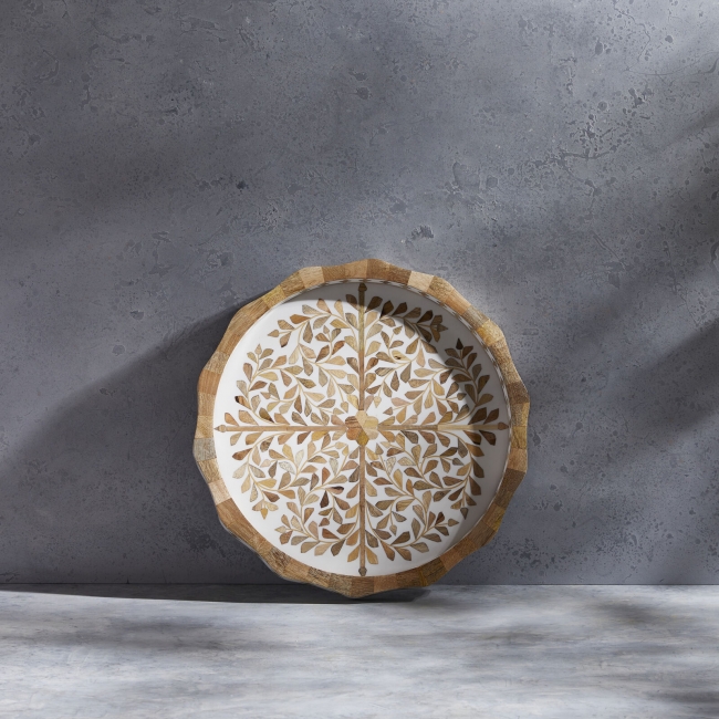 Κατασκευασμένοι από ξύλο ακακίας και με ένθετη ρητίνη και φίλντισι, οι δίσκοι Mya Inlay συνδυάζουν παραδοσιακά λουλουδάτα μοτίβα με μια καθαρή, μοντέρνα δομή. Το λουλουδάτο μοτίβο είναι σκαλισμένο και γεμισμένο στο χέρι, δημιουργώντας πολυεπίπεδες λεπτομέρειες σε μια λεία, κυματιστή σιλουέτα. Με προσεγμένο μέγεθος για σερβίρισμα ή επίδειξη, κάθε δίσκος είναι ζεστός, συγκροτημένος και φτιαγμένος με σκοπό την επίδειξη.