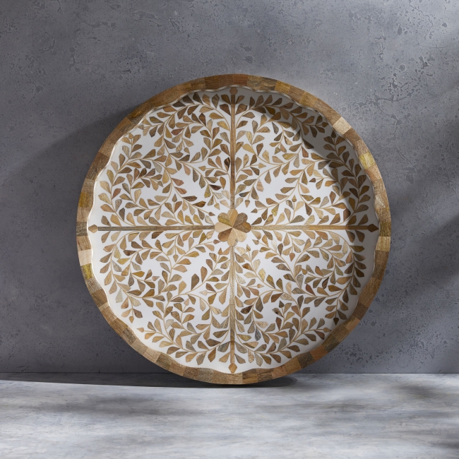 Κατασκευασμένοι από ξύλο ακακίας και με ένθετη ρητίνη και φίλντισι, οι δίσκοι Mya Inlay συνδυάζουν παραδοσιακά λουλουδάτα μοτίβα με μια καθαρή, μοντέρνα δομή. Το λουλουδάτο μοτίβο είναι σκαλισμένο και γεμισμένο στο χέρι, δημιουργώντας πολυεπίπεδες λεπτομέρειες σε μια λεία, κυματιστή σιλουέτα. Με προσεγμένο μέγεθος για σερβίρισμα ή επίδειξη, κάθε δίσκος είναι ζεστός, συγκροτημένος και φτιαγμένος με σκοπό την επίδειξη.