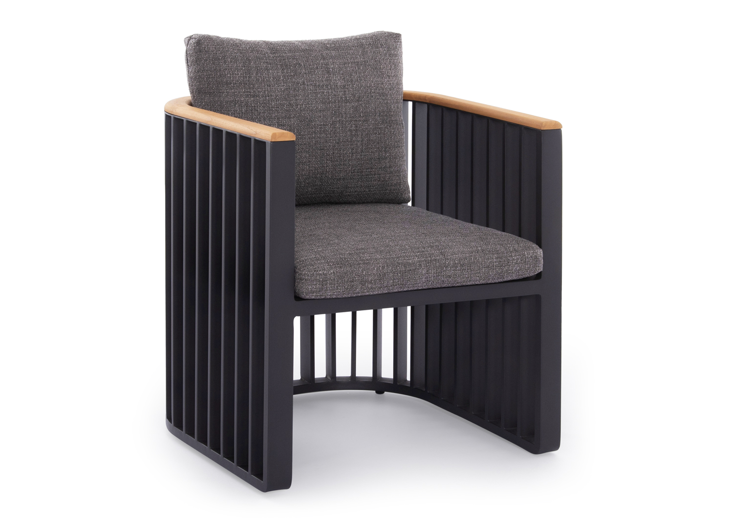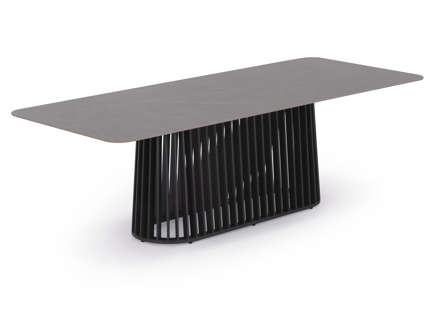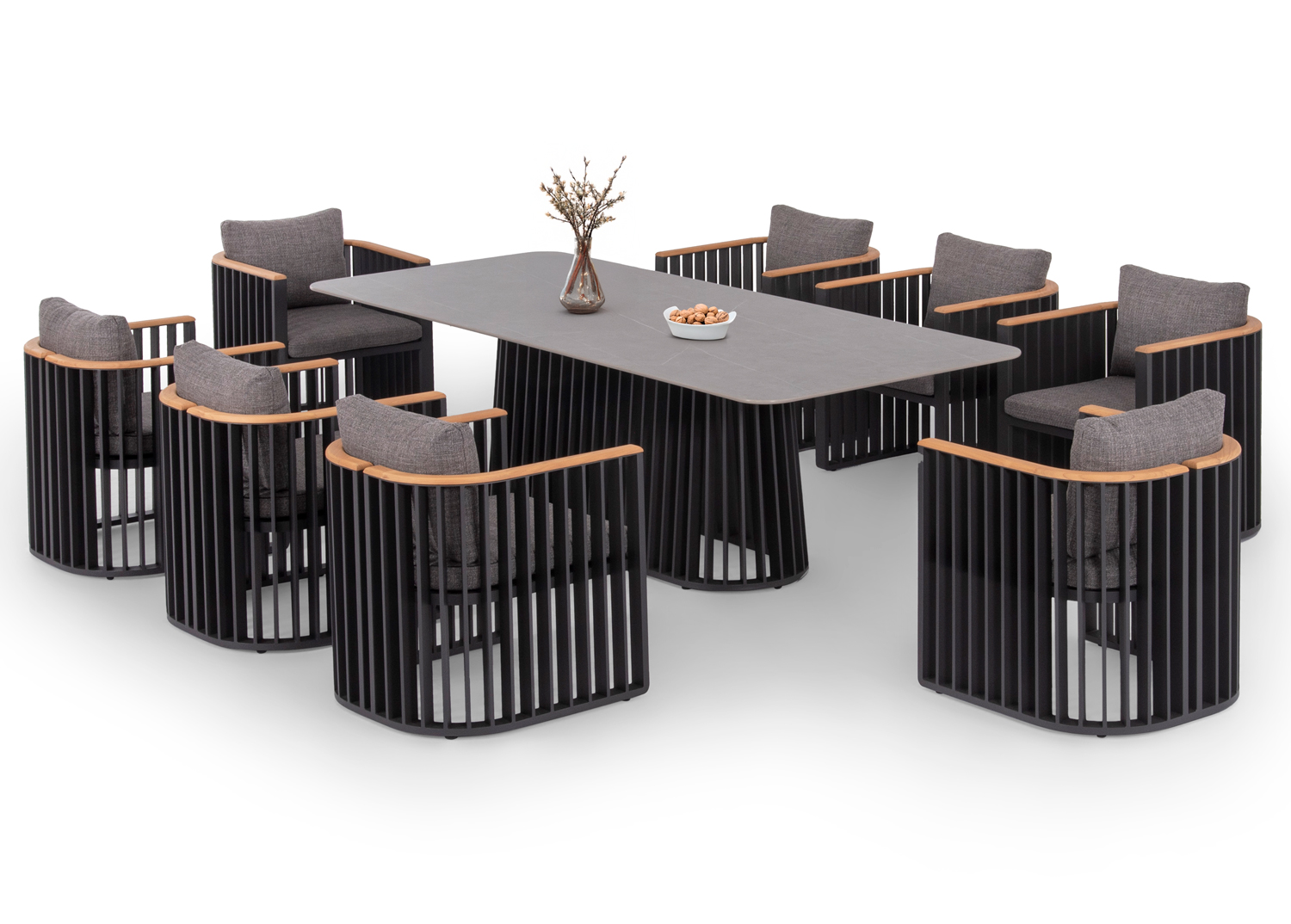 Σας παρουσιάζουμε ένα εντυπωσιακό σετ τραπεζαρίας εξωτερικού χώρου της σειράς ETERNITY.Με απαράμιλλη ποιότητα κατασκευής και υλικών, θα αναβαθμίσει την εικόνα σε όποιο χώρο επιθυμείτε. Το σετ αποτελείται από ένα μεγάλο ορθογώνιο τραπέζι με βάση αλουμινίου και επιφάνεια από SINTERED STONE σε χρωματισμό σκούρου γκρι μαρμάρου, και 8 πολυθρόνες παρόμοιας αισθητικής με μαξιλάρια καθίσματος και πλάτης, με ξύλο teak στα μπράτσα.