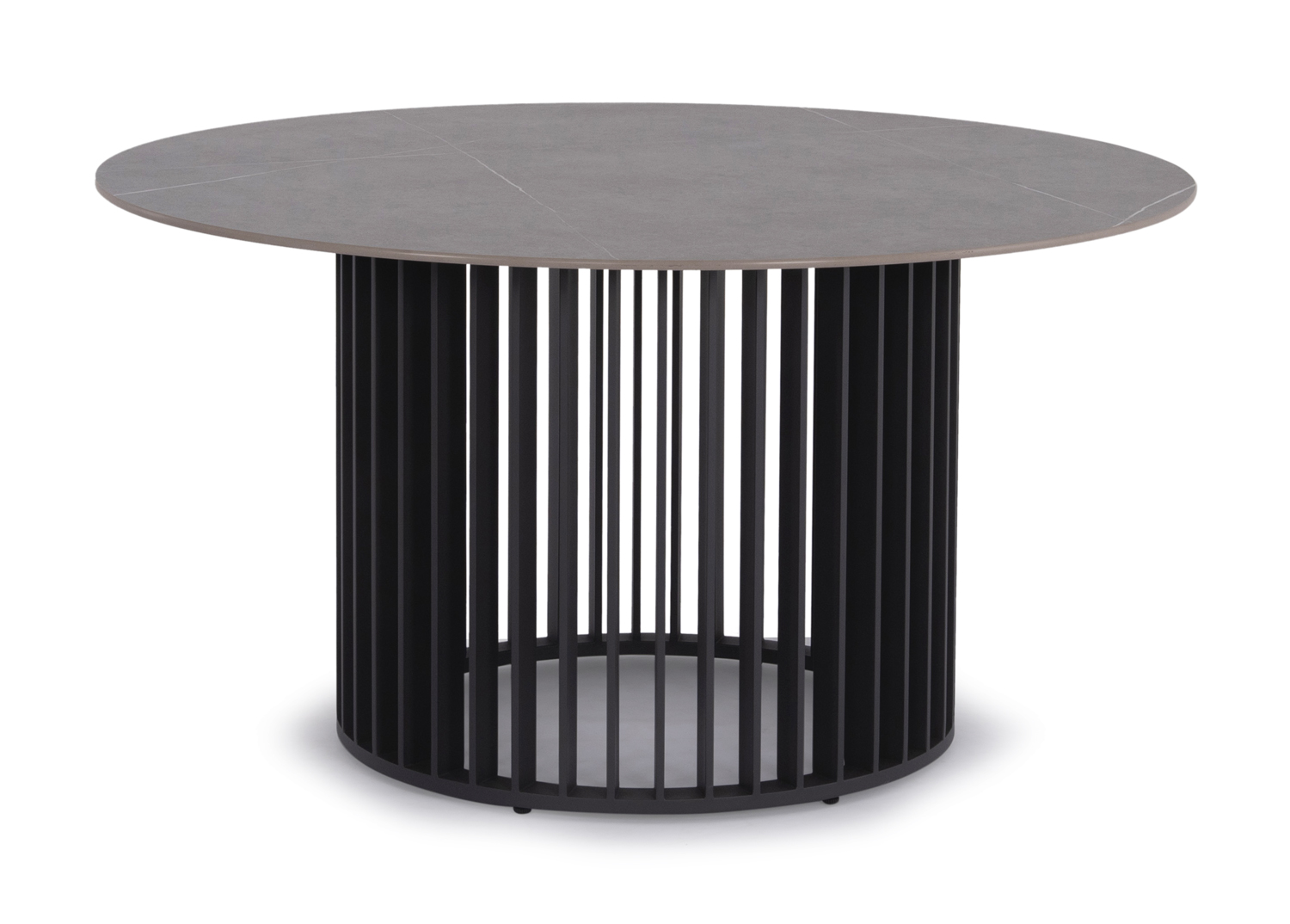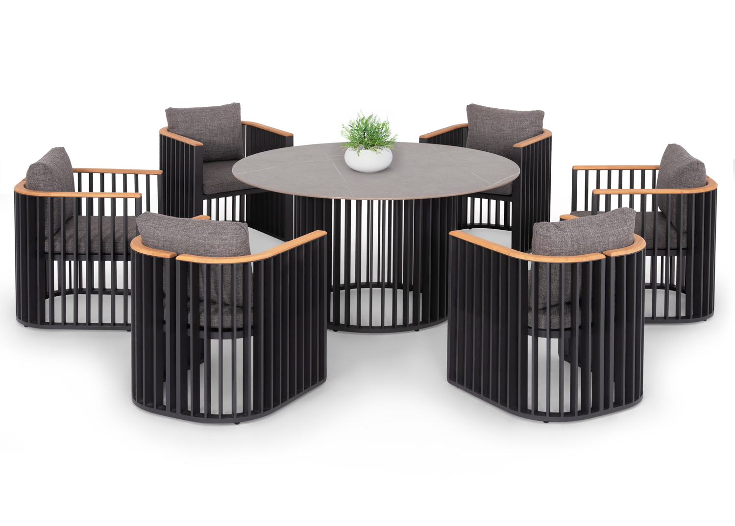 Σας παρουσιάζουμε ένα εντυπωσιακό σετ τραπεζαρίας εξωτερικού χώρου της σειράς ETERNITY σ! Με απαράμιλλη ποιότητα κατασκευής και υλικών, θα αναβαθμίσει την εικόνα σε όποιο χώρο επιθυμείτε. Το σετ αποτελείται από ένα στρογγυλό τραπέζι (ροτόντα) με βάση αλουμινίου και επιφάνεια από sintered stone σε χρωματισμό σκούρου γκρι μαρμάρου, και 6 πολυθρόνες παρόμοιας αισθητικής αλλά και μαξιλάρια καθίσματος και πλάτης, με  ξύλο teak στα μπράτσα.