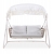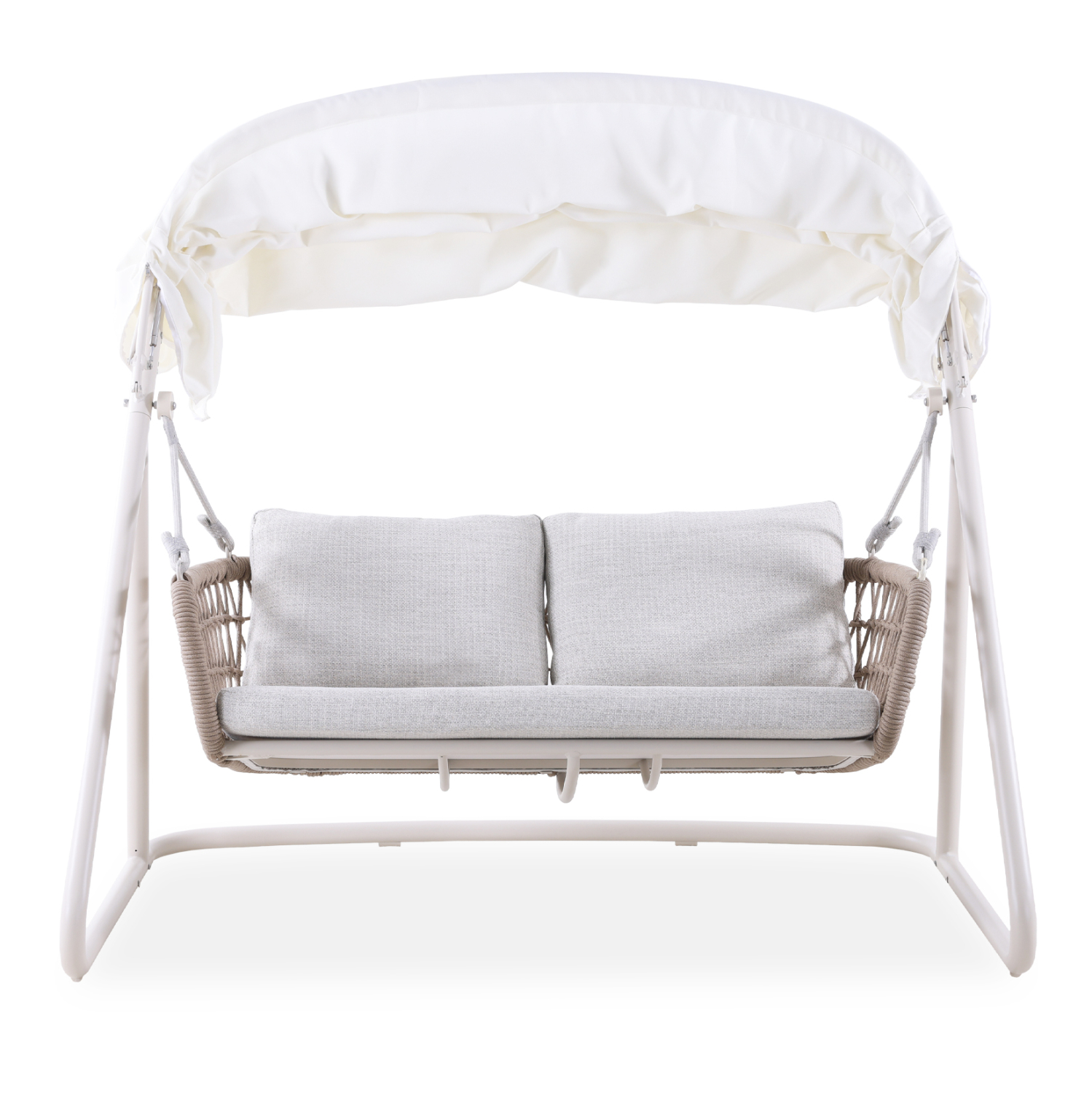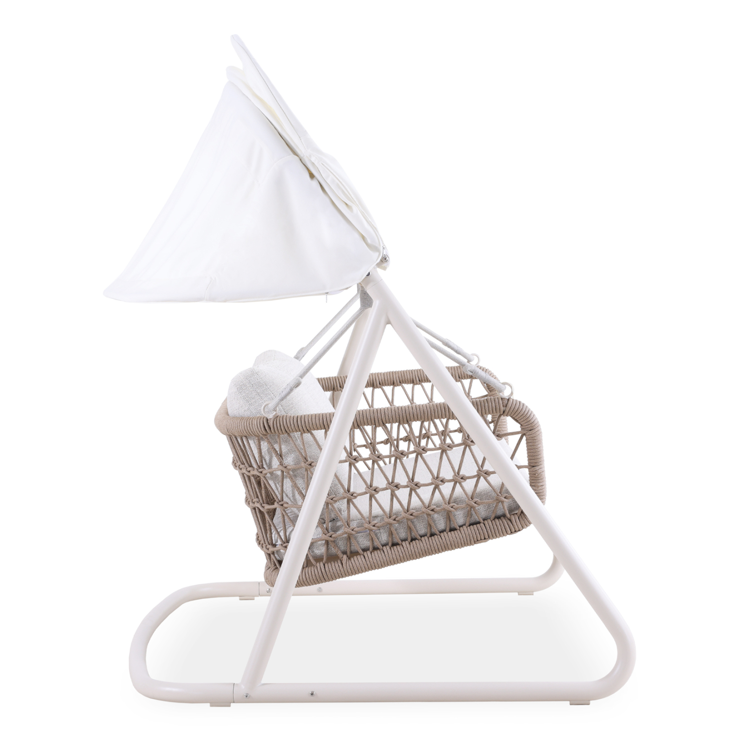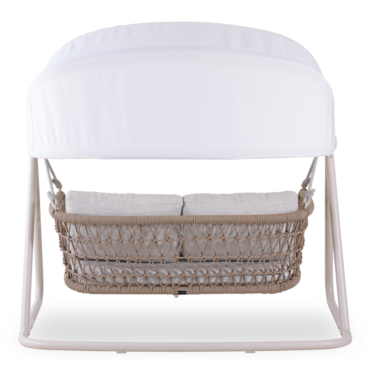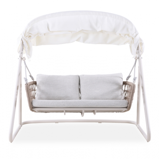 Ο σκελετός είναι σε χρώμα ΕΚΡΟΥ, ενώ τα μπράτσα και η πλάτη είναι επενδυμένα με σχοινί σε δικτυωτή (fishnet)πλέξη σε φυσικό χρώμα. Το ανοιγόμενο σκίαστρο της κούνιας είναι σε ΛΕΥΚΟ χρώμα, προσφέροντας ικανοποιητική σκίαση όποτε το θελήσετε, ενώ τα αναπαυτικά μαξιλάρια έχουν καλύμματα σε ανοιχτό ΜΠΕΖ χρώμα!