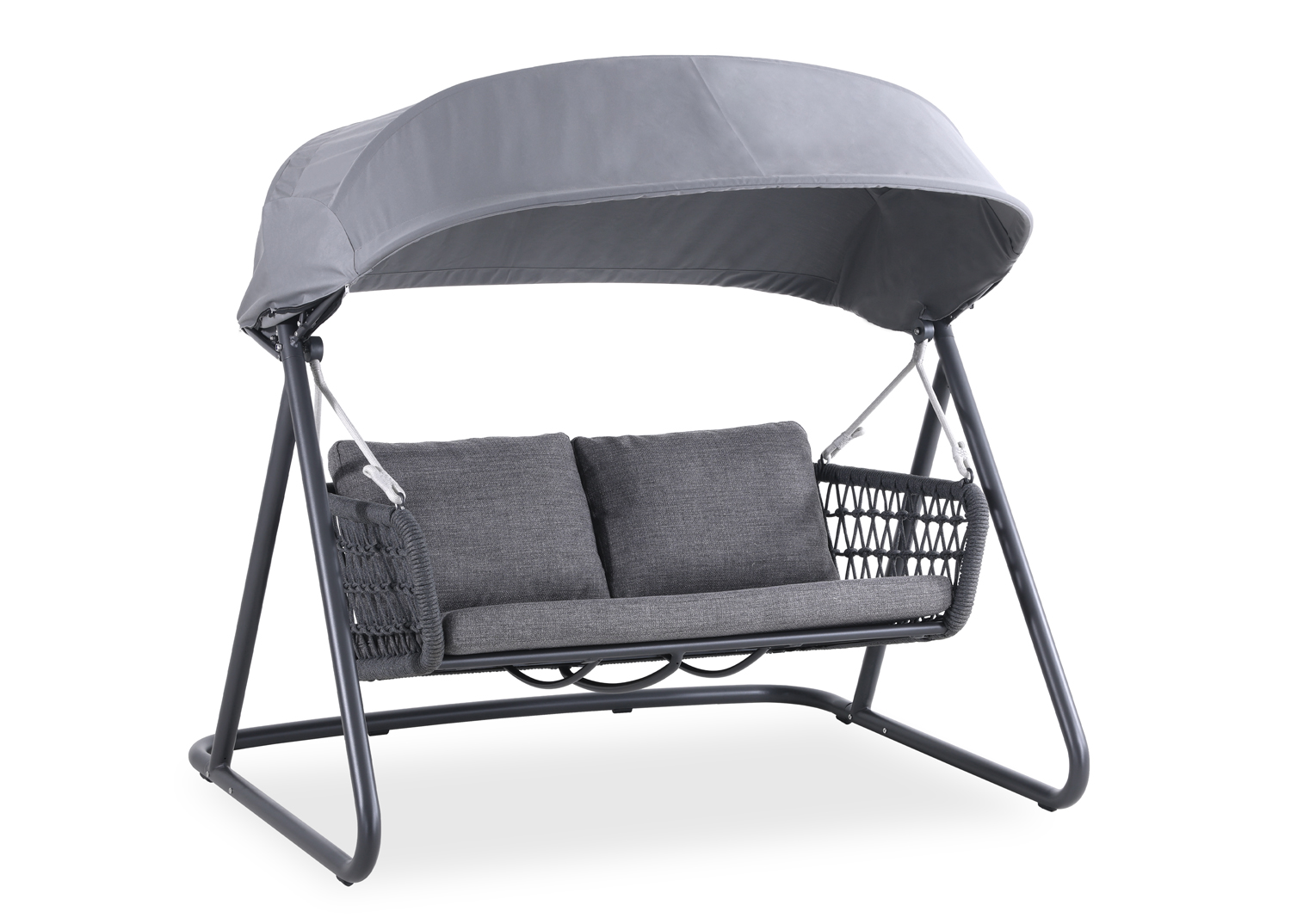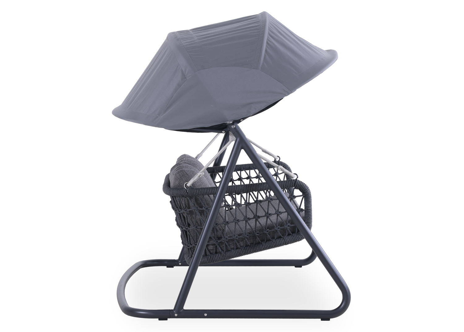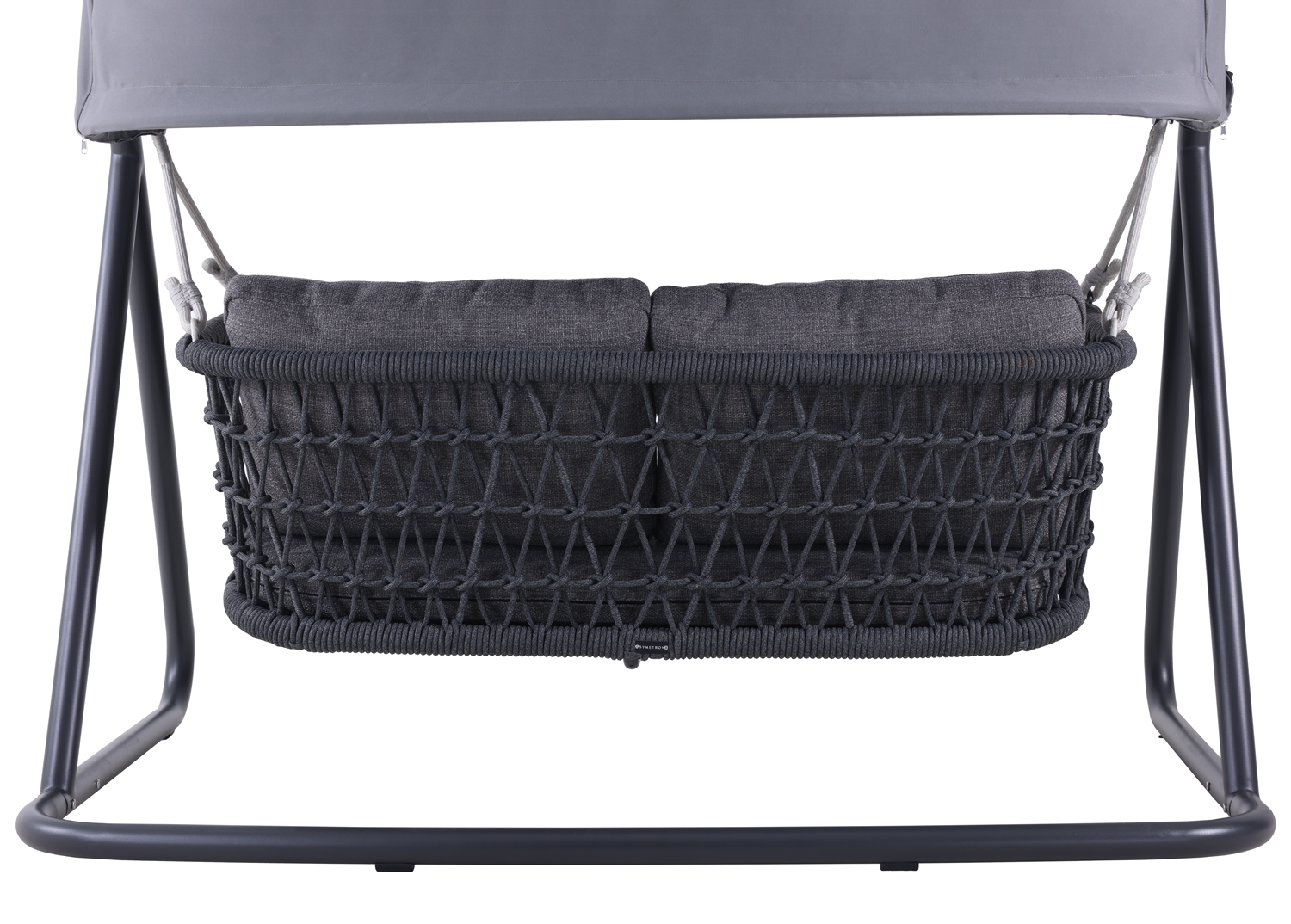 Ο σκελετός είναι σε χρώμα ανθρακί , ενώ τα μπράτσα και η πλάτη είναι επενδυμένα με σχοινί σε δικτυωτή (fishnet)πλέξη σε γκρι. Το ανοιγόμενο σκίαστρο της κούνιας είναι σε γκρι χρώμα, προσφέροντας ικανοποιητική σκίαση όποτε το θελήσετε, ενώ τα αναπαυτικά μαξιλάρια έχουν καλύμματα σε ανοιχτό γκρι χρώμα
