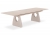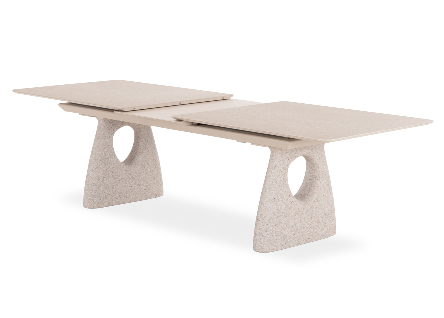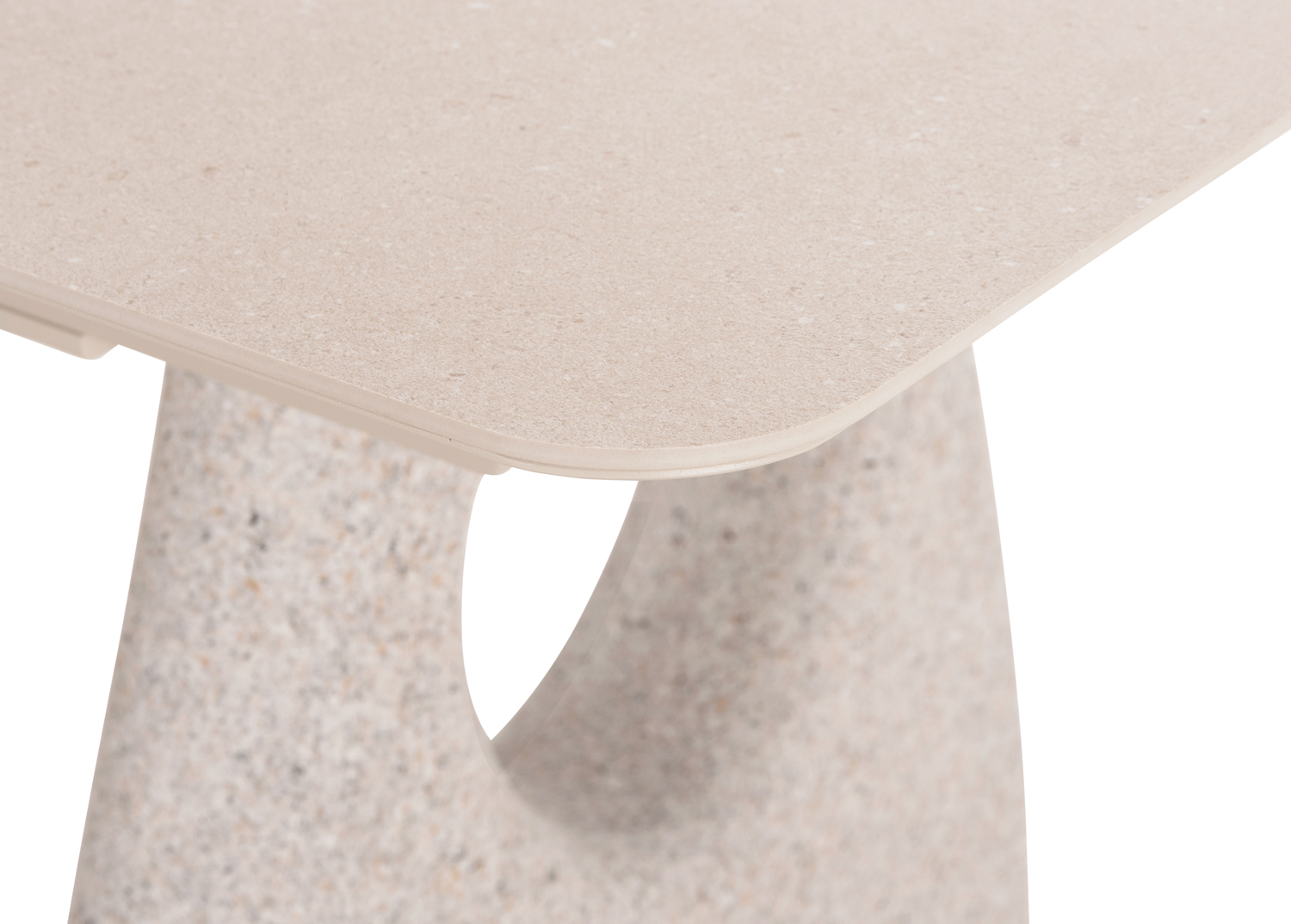 Το τραπέζι ξεχωρίζει η  επιφάνεια από sintered stone πάζους 6mm σε urano ivory απόχρωση και τα πόδια του τραπεζιού που είναι κατασκευασμένα από F.R.P. σε ανοιχτό χρώμα.