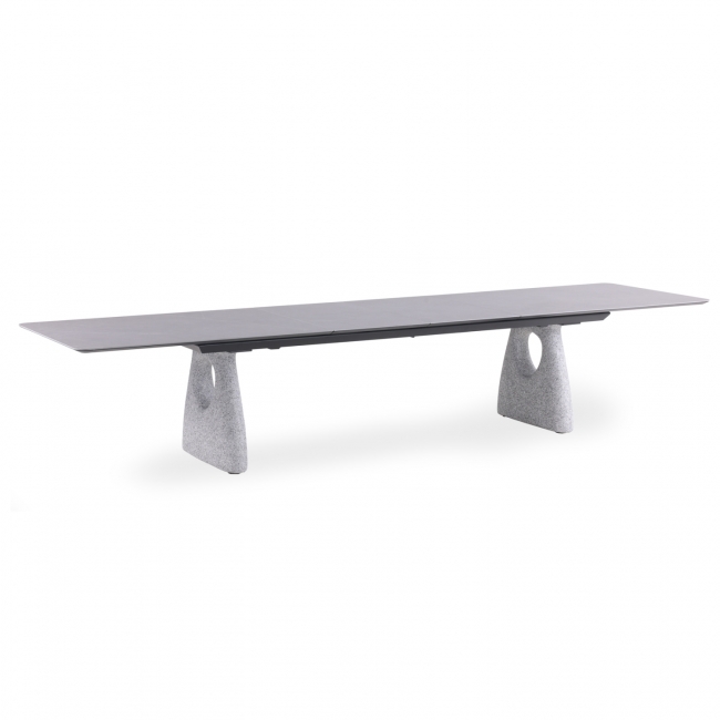 Το τραπέζι ξεχωρίζει η  επιφάνεια από sintered stone πάζους 6mm σε ανθρακί απόχρωση και τα πόδια του τραπεζιού που είναι κατασκευασμένα από F.R.P. σε γκρι χρώμα.