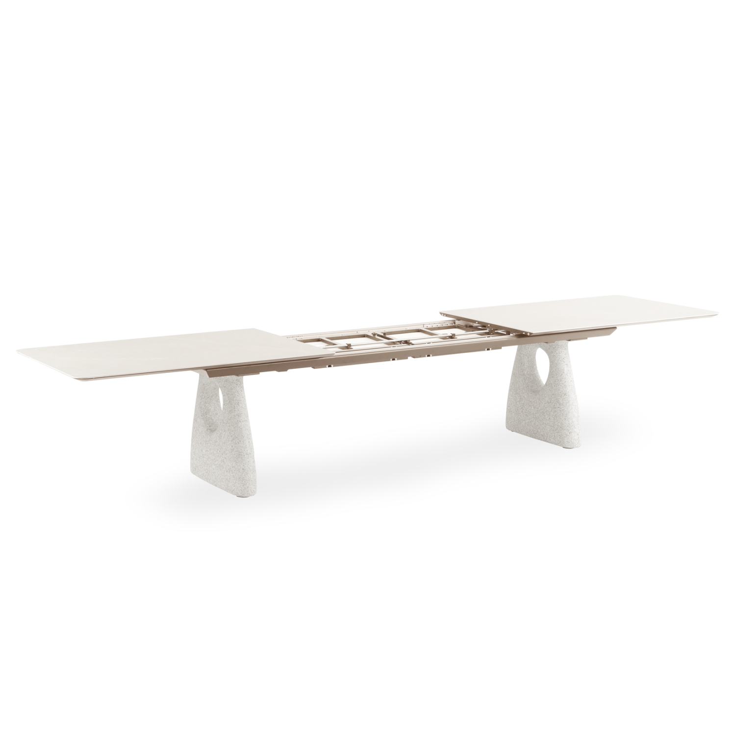 Το τραπέζι ξεχωρίζει η επιφάνεια από sintered stone πάζους 6mm σε urano ivory απόχρωση και τα πόδια του τραπεζιού που είναι κατασκευασμένα από F.R.P. σε ανοιχτό χρώμα.