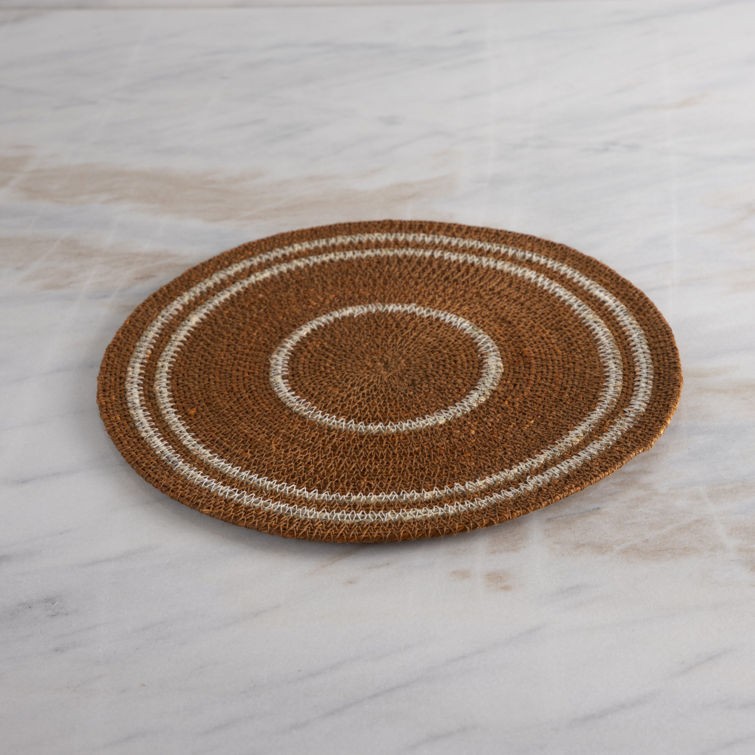 Αυτό το πολυτελές σουπλά, σε μια εντυπωσιακή απόχρωση σκουριάς, είναι κατασκευασμένο με άριστη τεχνική από βαμμένο υφαντό φύκι. Το μοναδικό στρογγυλό σχήμα και οι διακριτικές λευκές ρίγες προσθέτουν μια πινελιά κομψότητας σε κάθε τραπέζι. Αναβαθμίστε την εμπειρία φαγητού σας με το σουπλά Hydra.
