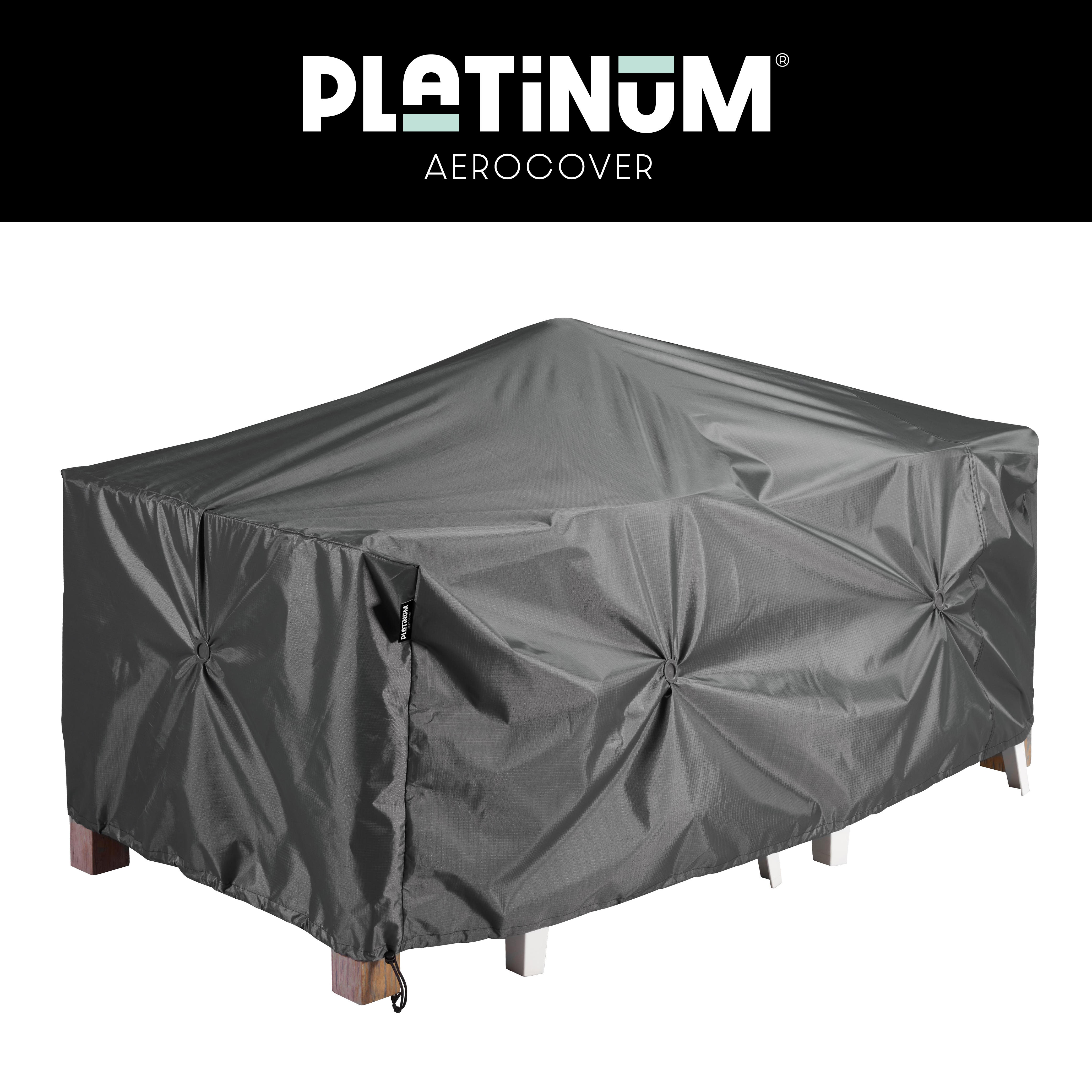 Κάλυμμα επίπλων κήπου Platinum AeroCover. Αναπνεύσιμο κάλυμμα επίπλων κήπου για ένα σετ κήπου 340x190cm. Κατάλληλο για ορθογώνια τραπέζια από 280cm έως 300cm με καρέκλες, μεταξύ άλλων. Τα Platinum AeroCover είναι αναπνεύσιμα, ανθεκτικά στο νερό, μειώνουν τη συμπύκνωση και αποτρέπουν τον σχηματισμό μούχλας. Το ύφασμα έχει υψηλή αντοχή χρώματος χάρη στις βαμμένες ίνες. Ένα κάλυμμα Platinum AeroCover παρατείνει τη διάρκεια ζωής των επίπλων κήπου σας. Τα Platinum AeroCover είναι κατασκευασμένα από ισχυρό και ελαφρύ πολυεστέρα ripstop. Είναι εύκολα στο χειρισμό και καταλαμβάνουν λίγο χώρο όταν δεν χρησιμοποιούνται. Το κάλυμμα διαθέτει κορδόνι περίσφιξης με 2 στοπ για καλή εφαρμογή. Περιλαμβάνει μια εύχρηστη τσάντα αποθήκευσης. Τα υφάσματα Platinum AeroCover είναι 100% αδιάβροχα. Οι ραφές είναι ανθεκτικές στα πιτσιλίσματα, όπως και κάθε άλλο κάλυμμα.