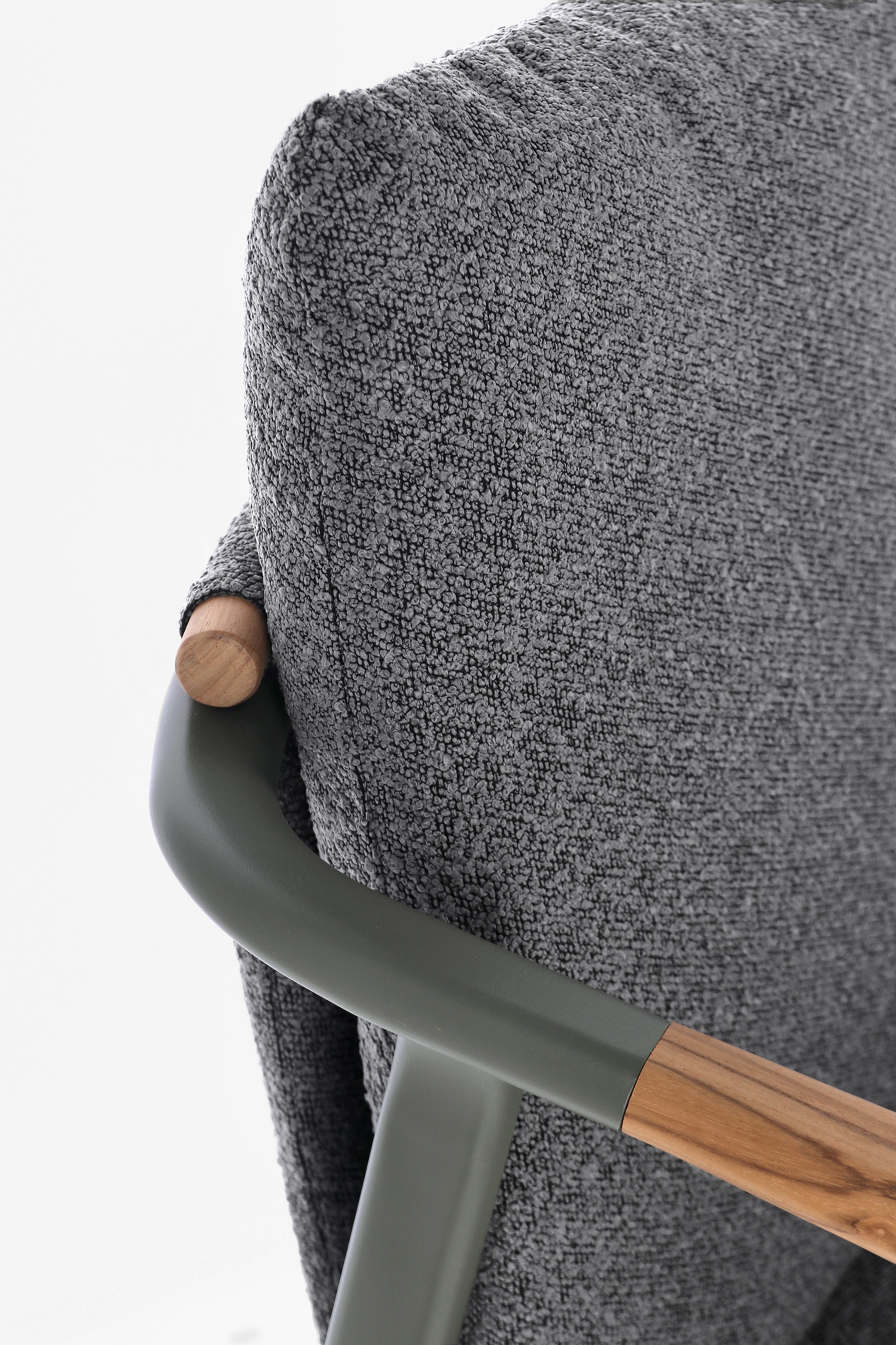 Σκελετός από αλουμίνιο με επικάλυψη πούδρας, ύφασμα υδατοαπωθητιικό ολεφίνης, με μπουκλέ εφέ. Τα μπράτσα και κομμάτι της πλάτης είναι από ξύλο teak. Διαθέσιμο κατόπιν παραγγελίας εντός 20 εργάσιμων ημερών