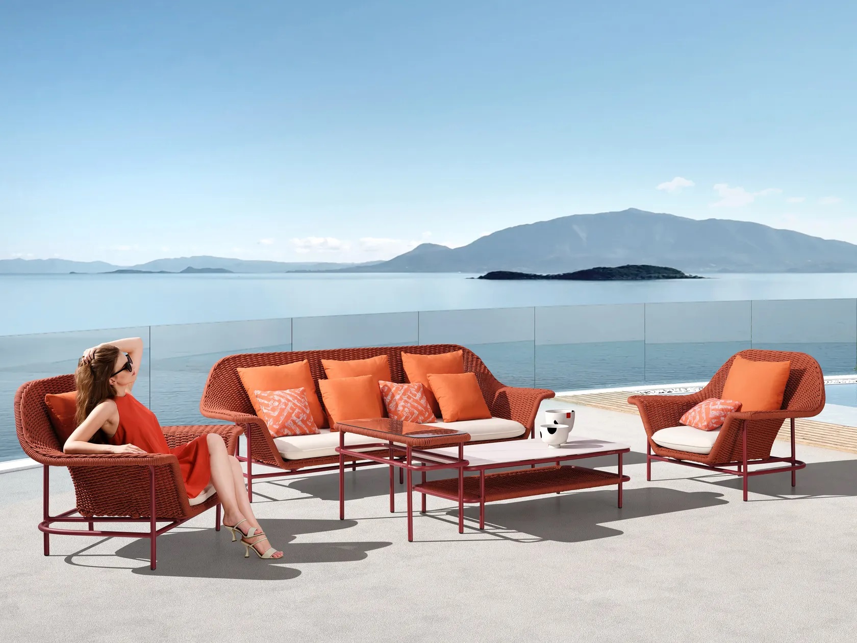 • Χαρακτηριστικά: Σετ, Καναπές Αλουμινίου, Σχεδιασμένο από τη France Pierrick Taillard για HIGOLD. Ο Pierrick Taillard, ως έμπειρος σχεδιαστής στη Γαλλία, είναι ένας σεβαστός οπαδός του Salvador Dali και χρησιμοποιεί αυτή τη μέθοδο στο αριστούργημα του Lisboa. Γενναιόδωρο στις αναλογίες του, άνετο και ευάερο, βασισμένο σε ένα συμπαγές και κομψό σκελετό αλουμινίου, αναδύεται το χρώμα του με Κόκκινο σχοινί Rope. Αυτή η φωλιά υφασμένη από τους καλύτερους τεχνίτες θα σας εντυπωσιάσει με την απαλότητά της. Είναι μια πολυθρόνα που σας προσκαλεί στη μεσογειακή χαλάρωση. Το σετ αποτελείται από 2 πολυθρόνες, έναν 3θέσιο καναπέ, 1 τραπεζάκι βοηθητικό και 1 τραπεζάκι μέσης