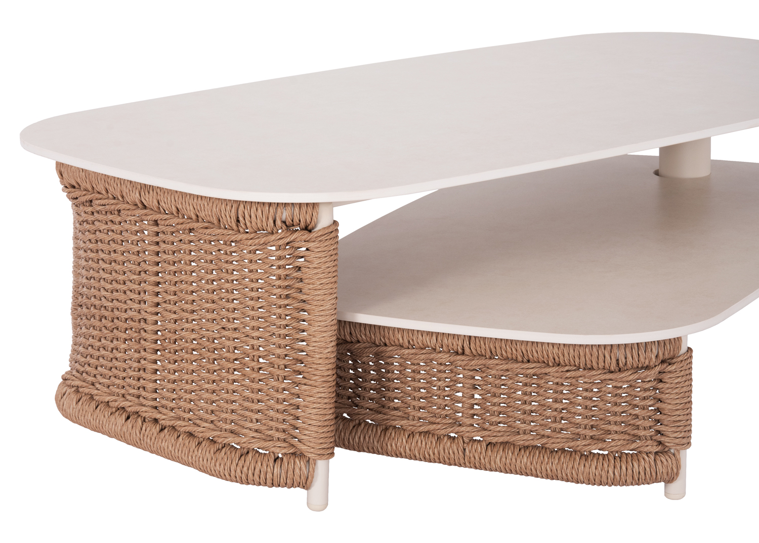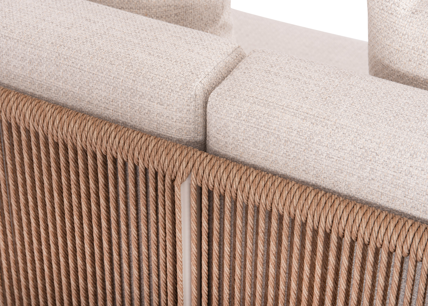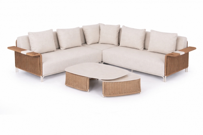 Γωνιακό καθιστικό κήπου από 2 καναπέδες, μία γωνία και δύο βοηθητικά τραπεζάκια.