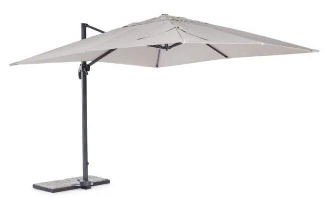 Χαρακτηριστικά: Ομπρέλα με σκελετό αλουμινίου (powder coated), 8 ακτίνες, κάθετη κλίση 5 θέσεων και βάση περιστρεφόμενη 360° από ατσάλι. Περιλαμβάνει πλάγιο στύλο στήριξης. Δεν περιλαμβάνει πλάκες τσιμεντένιες.