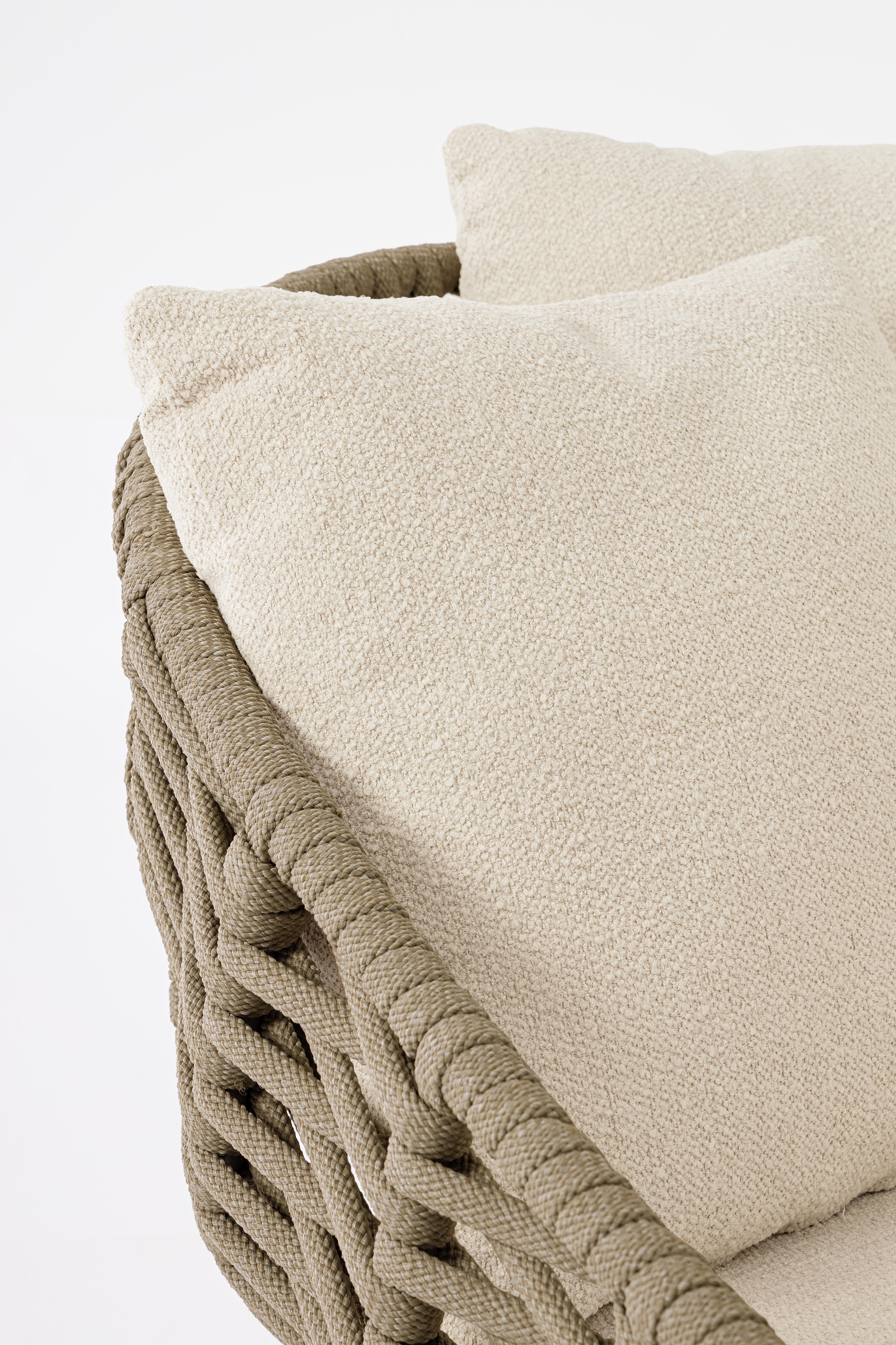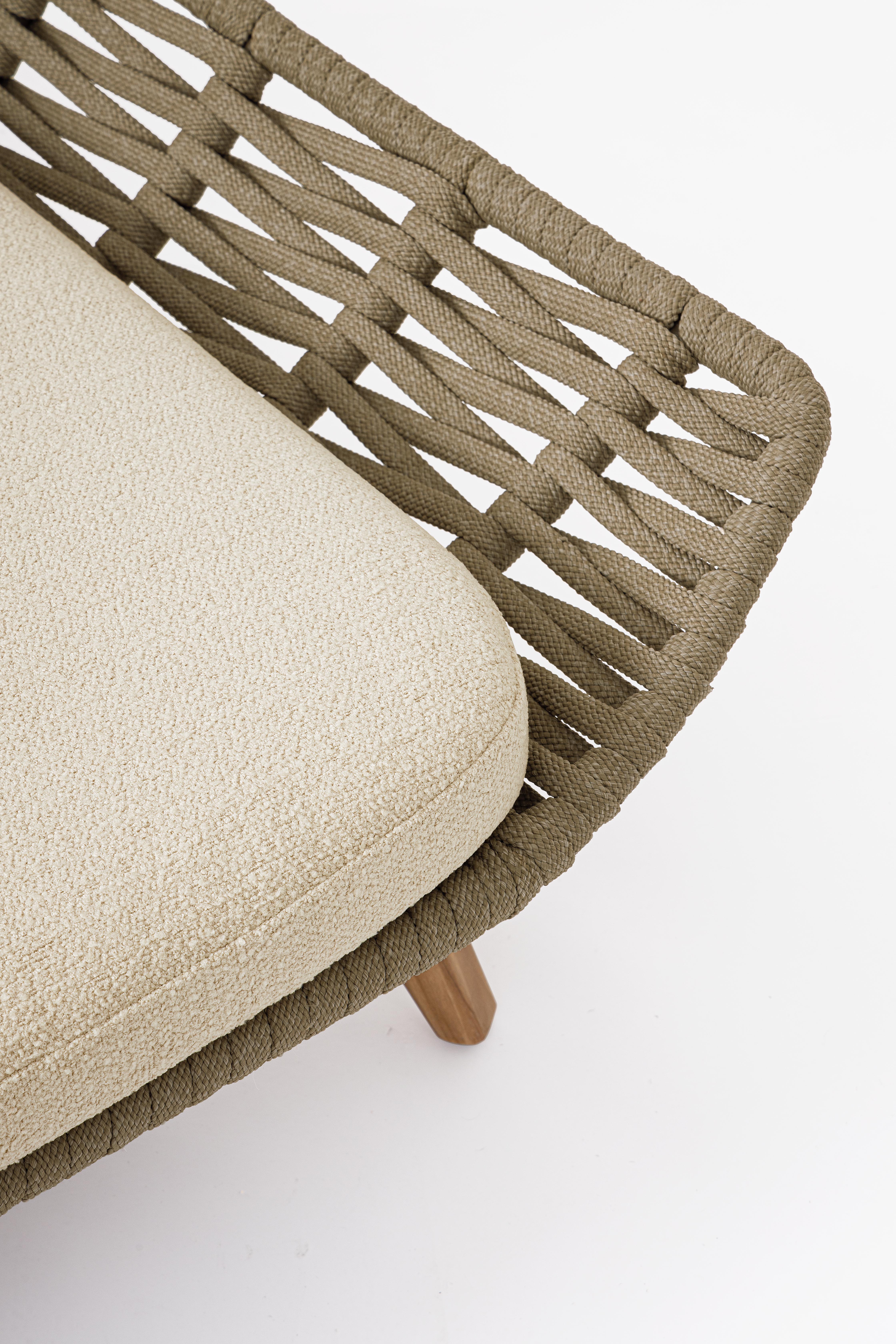 Σκελετός Αλουμινίου με επίστρωση πούδρας (πολυεστέρα), Πόδια με Ξύλο teak - svlk με φυσικό φινίρισμα, πλέξη από Σχοινί Πολυπροπυλενίου και βίδες από ανοξείδωτο ατσάλι. Περιλαμβάνει Μαξιλάρι με αφαιρούμενο κάλυμμα με αντηλιακή προστασία olefin (100% polypropylene).