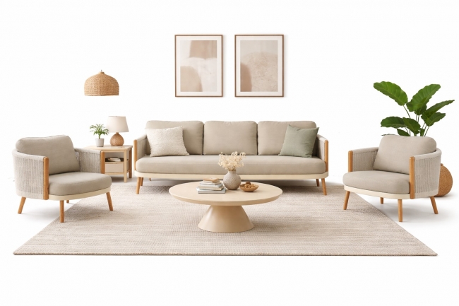 Το καθιστικό αποτελείται από έναν τριθέσιο καναπέ, δυο πολυθρόνες και 2 βοηθητικά τραπεζάκια. Τα μαξιλάρια συμπερλαμβάνοτναι.