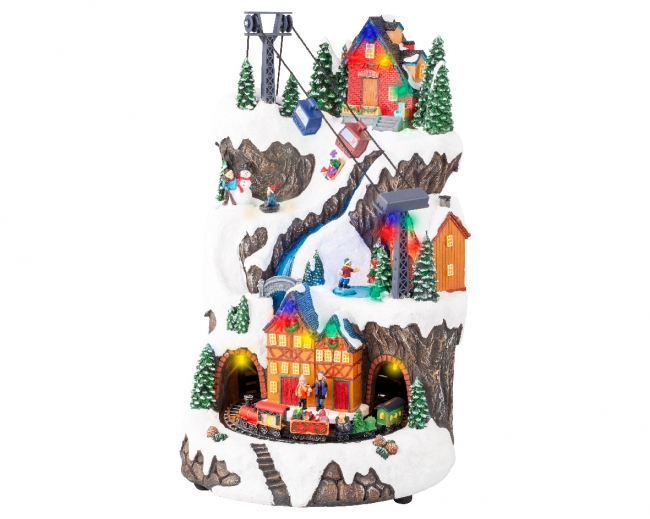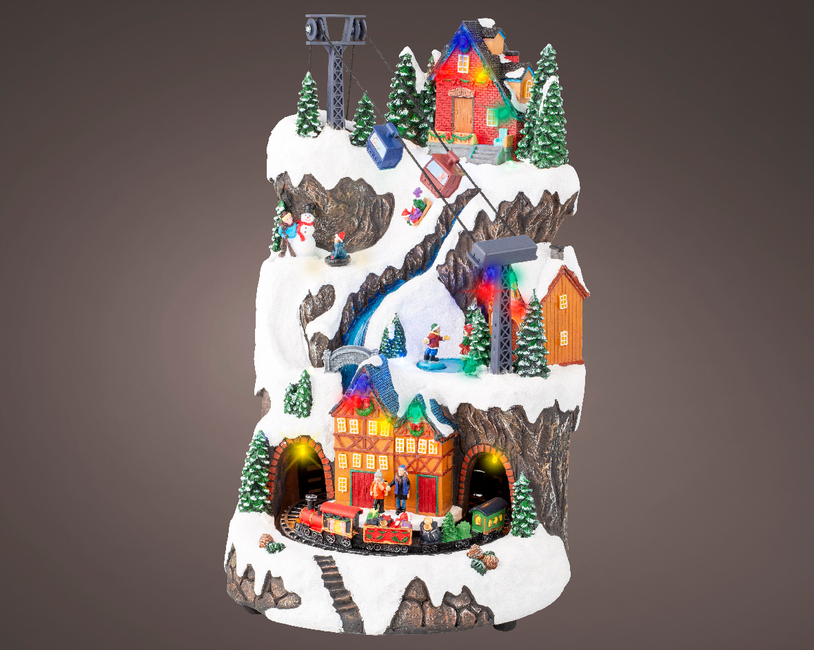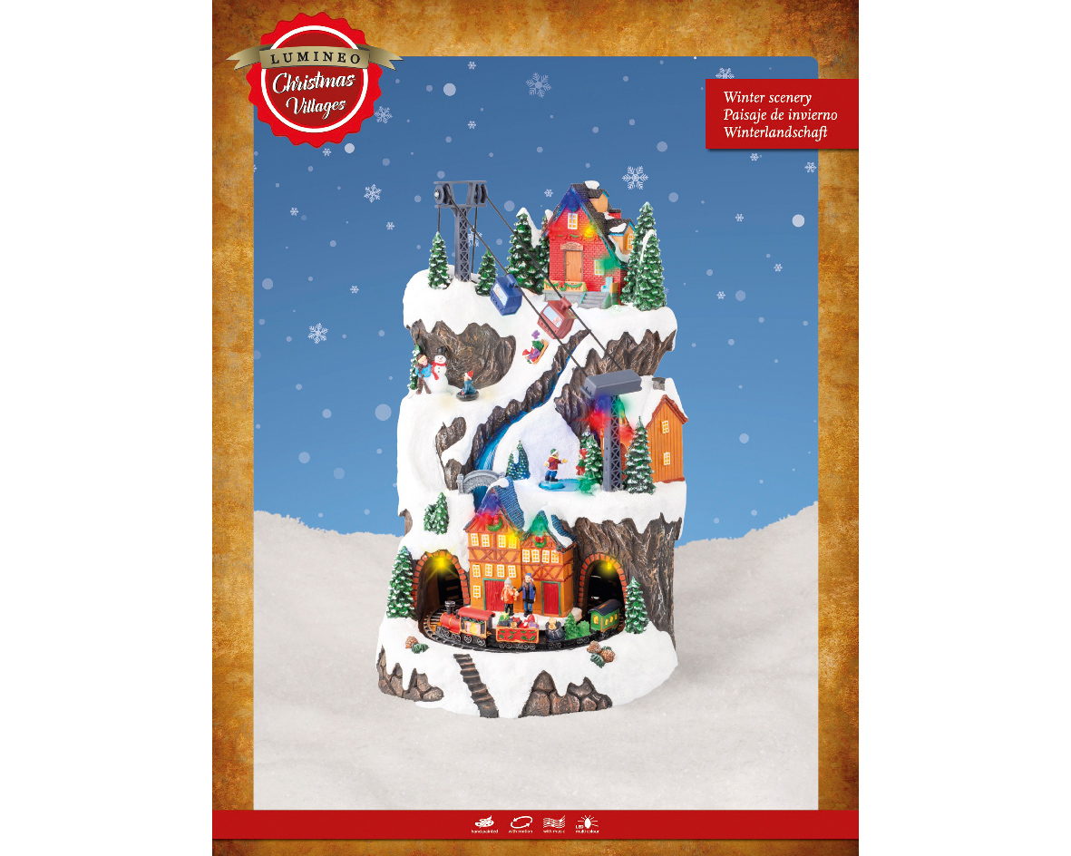 Χιονισμένο χωριό με σπίτια και σιδηροδρομικό σταθμό, συνθέτουν μια Χριστουγεννιάτικη σκηνή από άλλη εποχή! Ήχος, φως και κίνηση δίνουν την ώθηση να ζήσεις τα Χριστούγεννα μιας άλλης δεκαετίας!