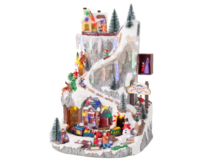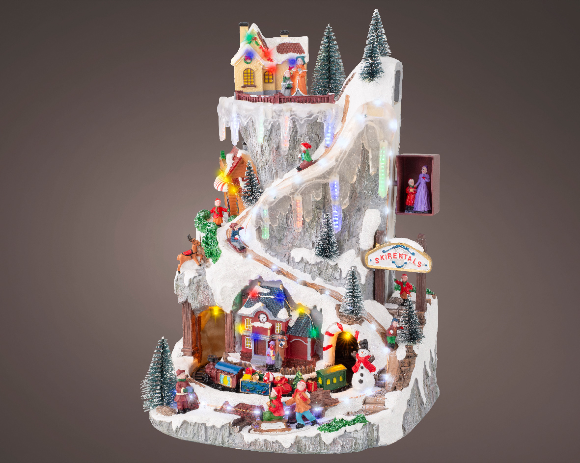 Χιονισμένο χωριό με σπίτια και σιδηροδρομικό σταθμό, συνθέτουν μια Χριστουγεννιάτικη σκηνή από άλλη εποχή! Ήχος, φως και κίνηση δίνουν την ώθηση να ζήσεις τα Χριστούγεννα μιας άλλης δεκαετίας!